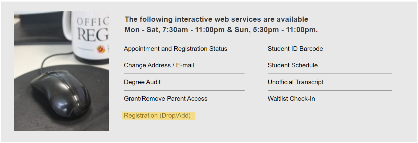 Registration is conducted on Testudo. Select the Registration (Drop/Add) link to add/drop classes.